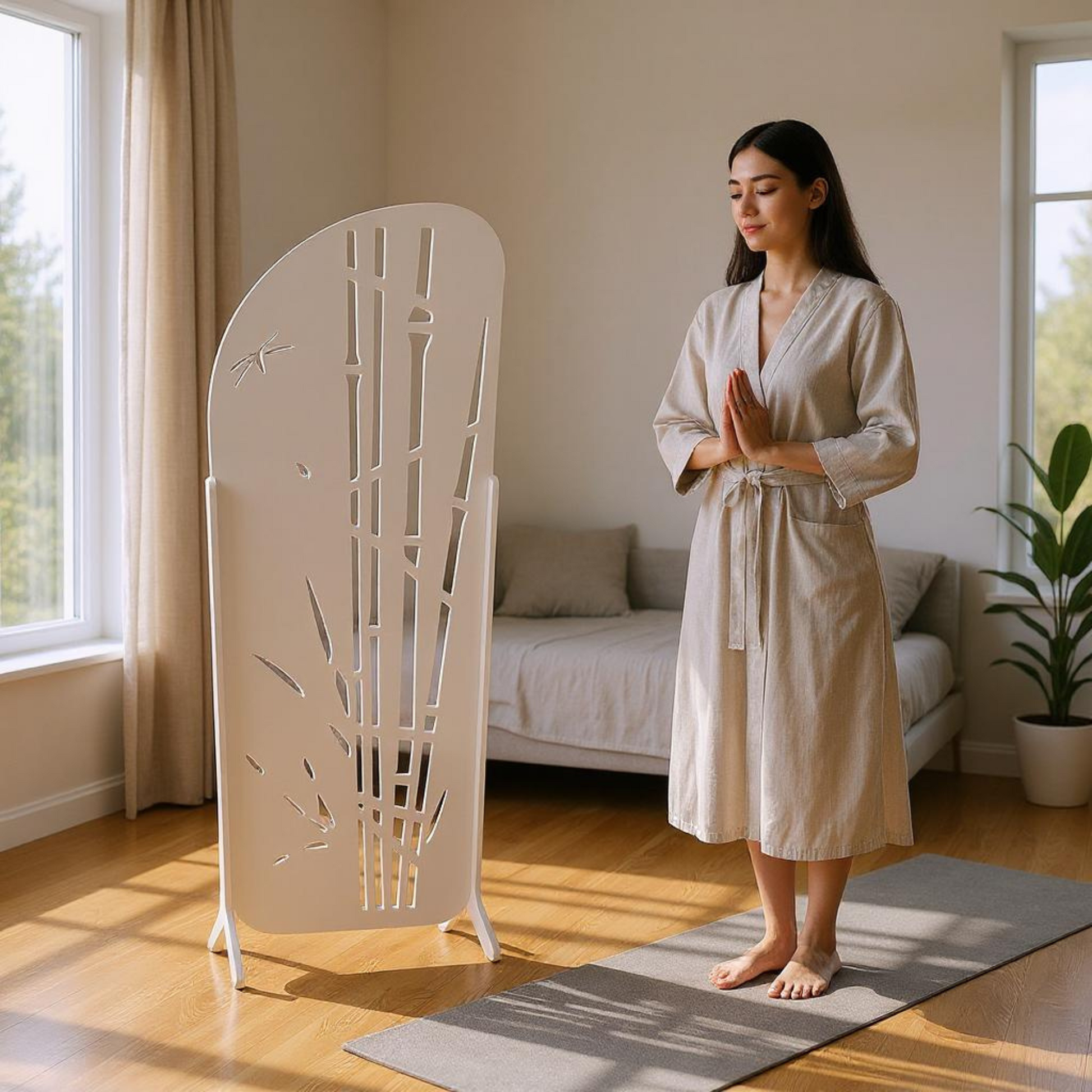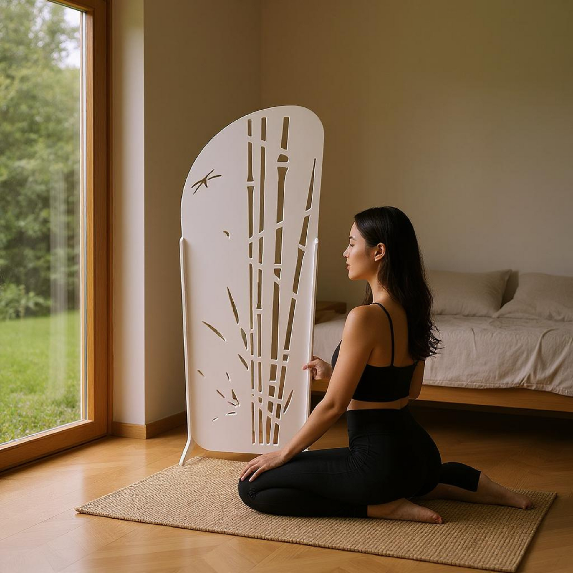 Apportez une touche de poésie à vos espaces avec le Claustra Luminéa Nomade , un panneau ajouré à la silhouette douce et organique, illustré de tiges de bambou et d'une libellule en plein envol. Son motif épuré laisse passer la lumière tout en créant une séparation délicate entre les espaces, sans alourdir la pièce.