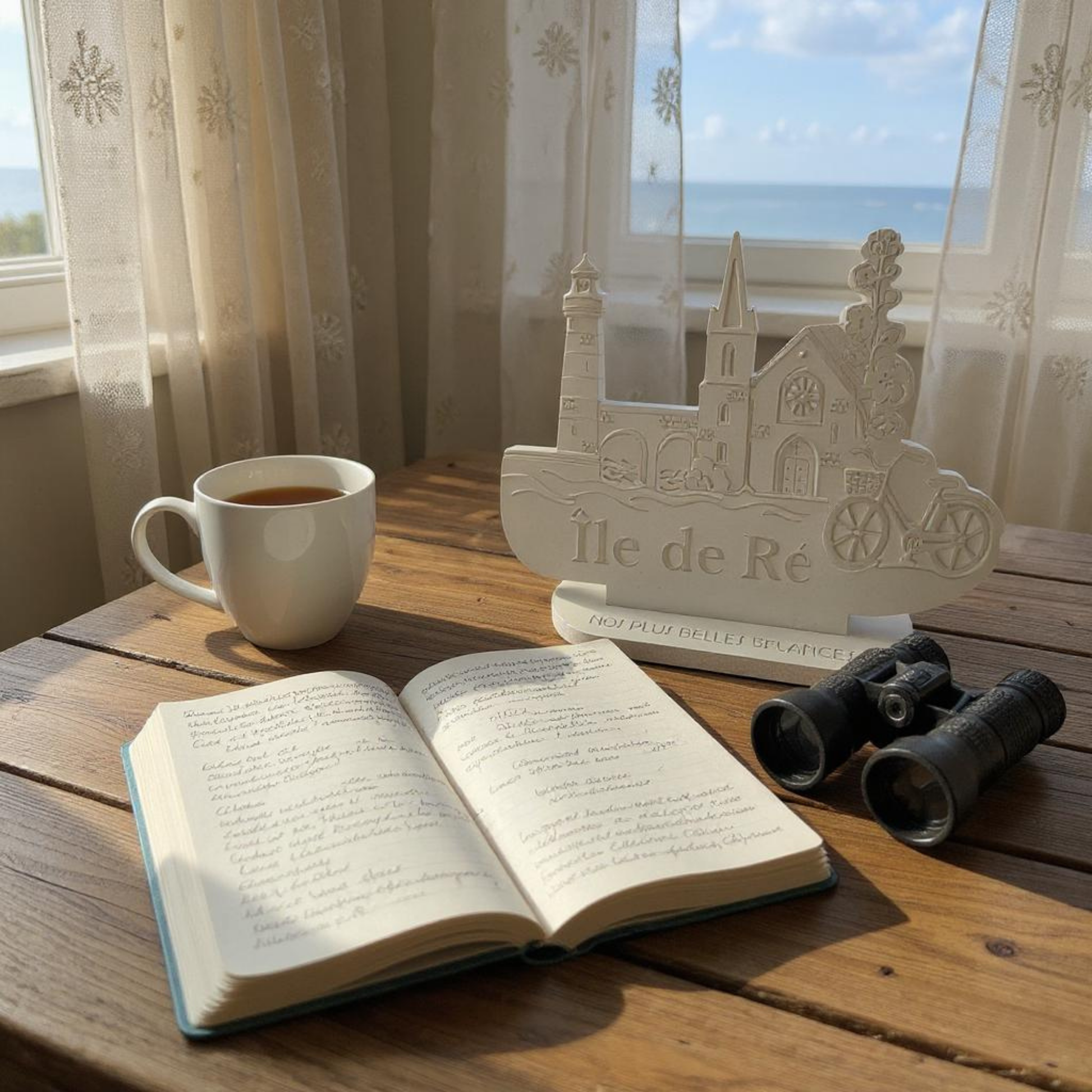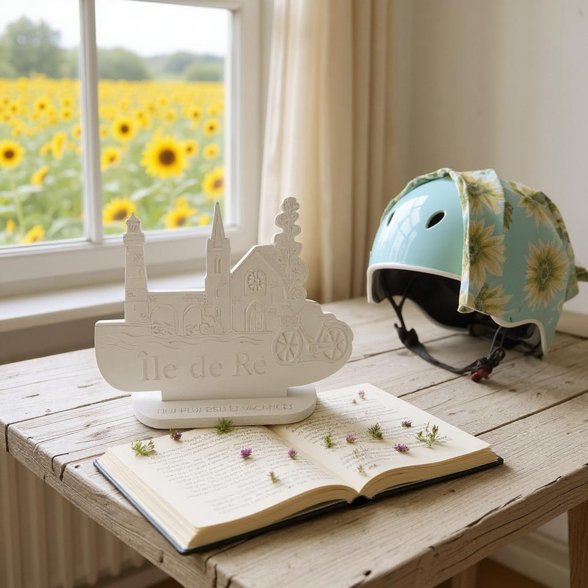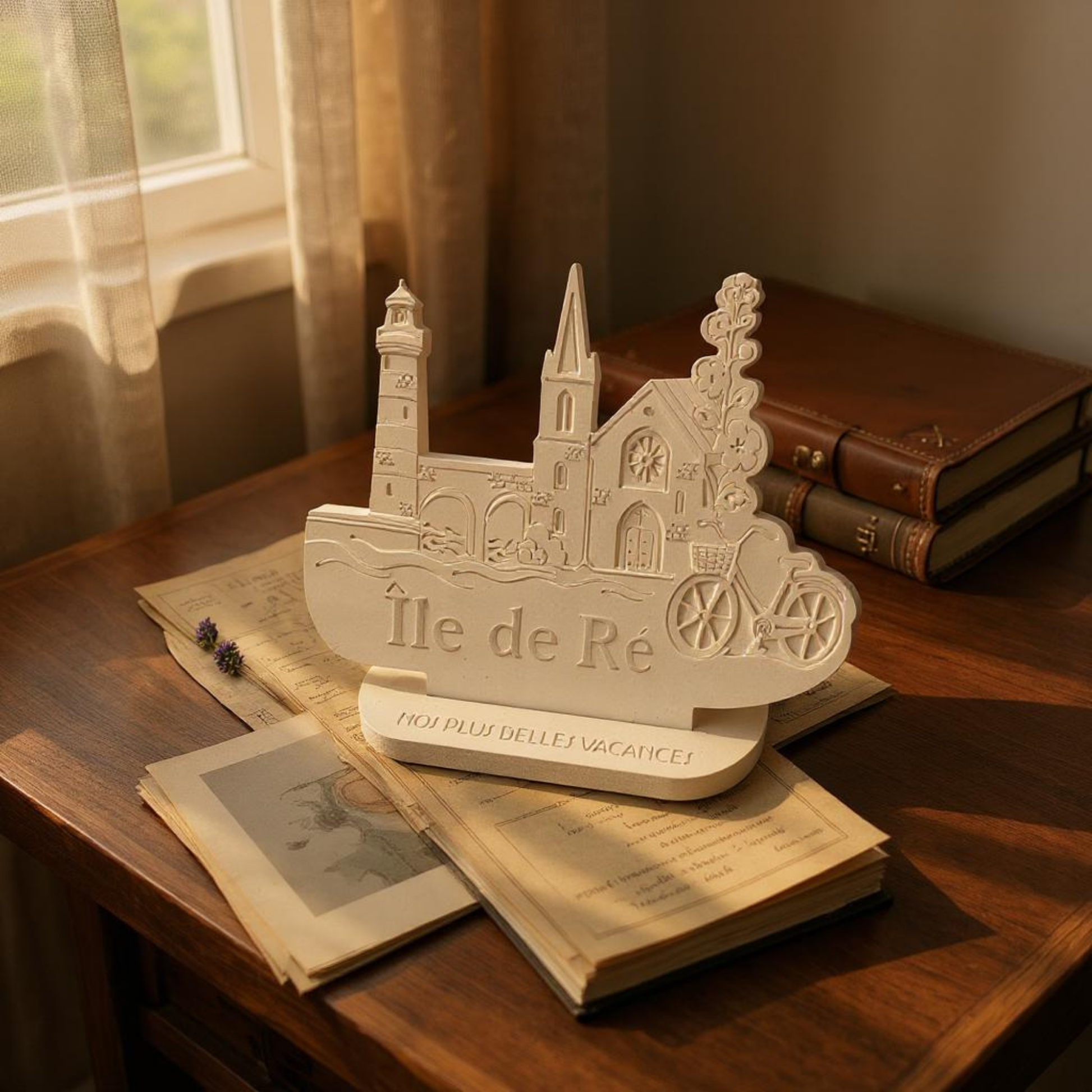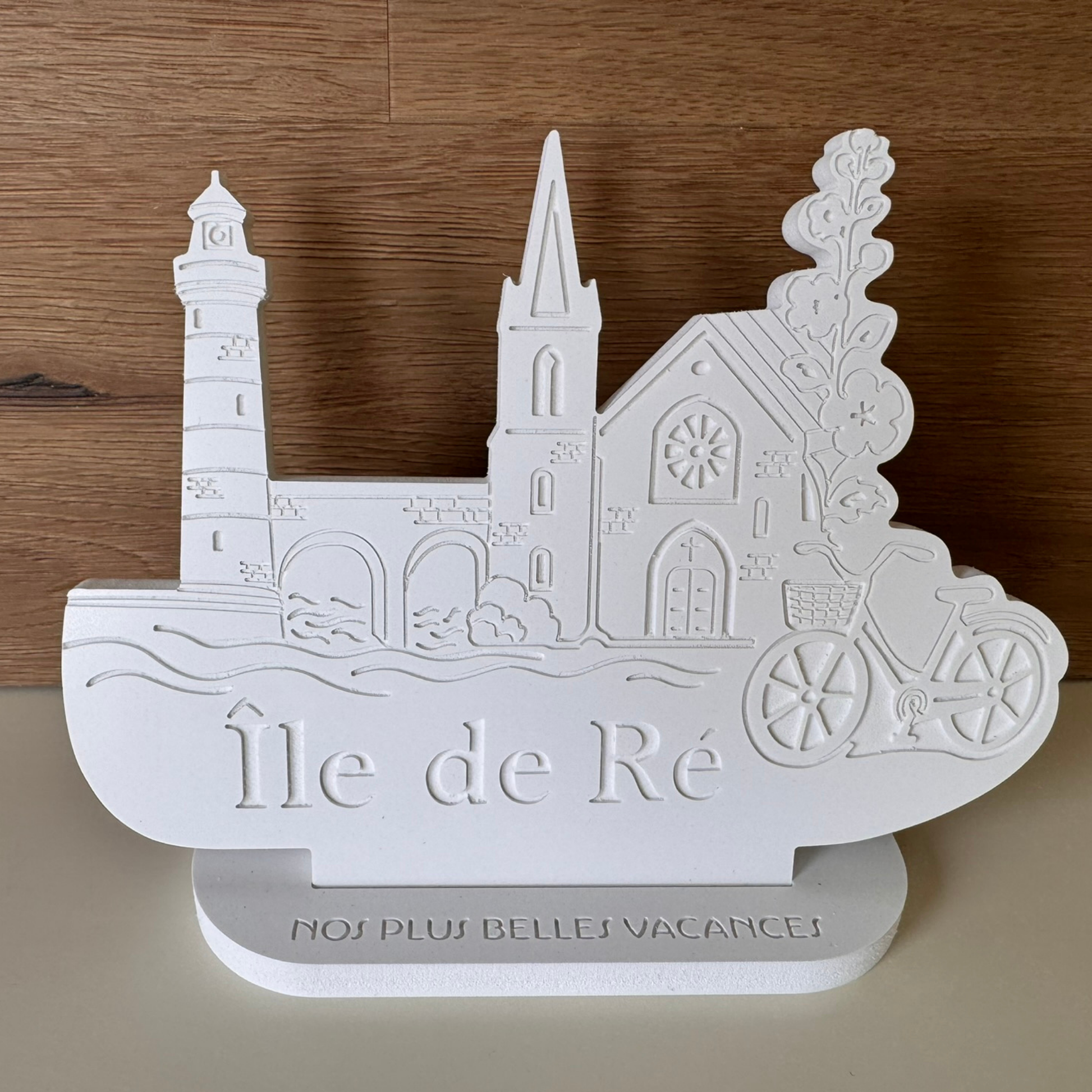 Retrouvez tout le charme de l'Île de Ré dans cette création délicate en relief. Entre les ruelles fleuries, le clocher rétais, les phares emblématiques et la fameuse bicyclette, chaque détail rappelle la douceur de vivre de cette destination prise.