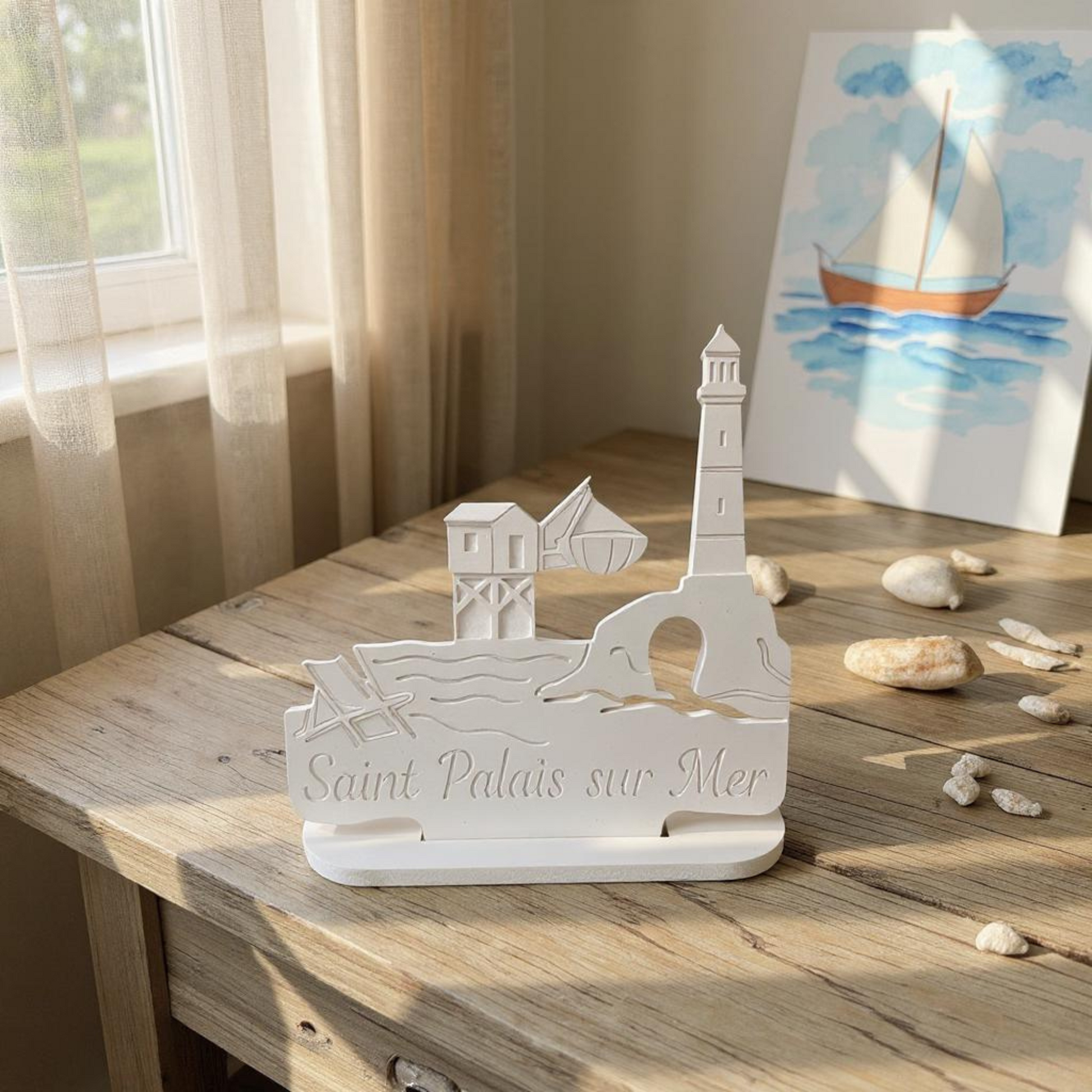 Plongez dans l'atmosphère apaisante de Saint-Palais-sur-Mer grâce à cette création poétique en PVC blanc découpé avec finesse. Cette scène emblématique met en valeur le phare, les carrelets de pêche, les transats au bord de l'eau, et les rochers typiques de la côte charentaise.